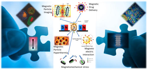 c) originate tunable electric signals via magnetoelectric interactions, provided the magnetic nanoparticles are adequately designed (with respect to size, shape, constituent materials) to exploit the combinatory field schemes. Additionally, magnetic particle imaging and magnetic drug delivery perspectives are foreseen with proper functionalization schemes.